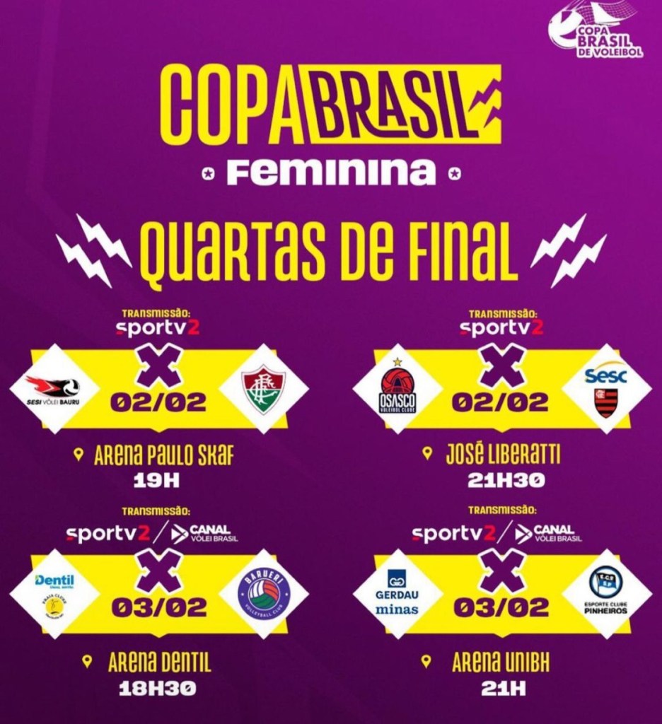 Com o encerramento do turno da Superliga Feminina 2022/2023, foram definidos os confrontos da Copa do Brasil feminina de vôlei 2023. Os oito primeiros colocados do turno da Superliga enfrentam-se em jogo único, pelas quartas de final da competição. O líder da fase regular da Superliga, Praia Clube, pega a equipe de José Roberto Guimarães, Barueri. O segundo colocado, Minas, joga contra o Pinheiros, sétimo colocado. O Osasco, terceiro colocado, enfrenta, o Sesc/Flamengo de Bernardinho, sexto colocado. Fechando os confrontos das quartas da Copa do Brasil feminina 2023, o Sesi/Bauru, 4º colocado, terá pela frente o Fluminense, 5º colocado. As finais da Copa do Brasil feminina 2023 acontecem no início de março, em Jaraguá do Sul, Santa Catarina.
