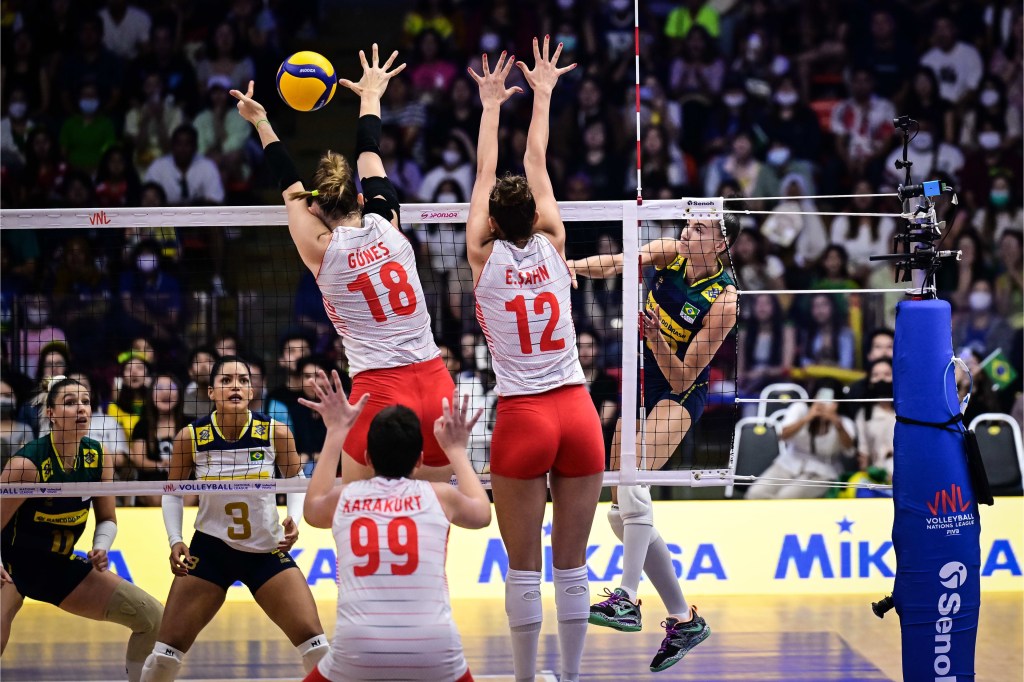 Pela terceira semana da Liga das Nações feminina 2023, o Brasil foi derrotado pela Turquia. Foi a quarta derrota brasileira na competição. Jogando em Bangcoc, na Tailândia, as brasileiras foram superadas pelas turcas, em sets diretos, com parciais de 25/22, 25/16, 25/22. O Brasil correu atrás no placar, nas duas primeiras parciais. O volume de jogo turco era muito grande. A Turquia não desperdiçava as chances de contra-ataques. O bloqueio turco colocava o Brasil em dificuldades. Ao final do jogo, o bloqueio da Turquia somou 13 pontos diretos no fundamento contra apenas 5 do Brasil. O técnico do Brasil, Zé Roberto, foi para o tudo ou nada, deslocando Maiara Basso da ponta para saída de rede. O Brasil até esboçou uma reação, mas não teve jeito, mesmo errando mais, a Turquia fechou o jogo em 3×0. Karakurt foi a maior pontuadora do confronto, com 19 pontos. Pelo Brasil, Maiara Basso anotou 12 pontos. Com o resultado, o Brasil precisa vencer o seu jogo contra Tailândia, para garantir classificação nas finais, sem depender de outros resultados. O confronto está marcado para domingo, 2 de julho, às 10h30, com transmissão do SPORTV 2. Já a Turquia, encerra sua participação na 1ª fase contra a Croácia. A seleção europeia já está classificada para as finais nos Estados Unidos.