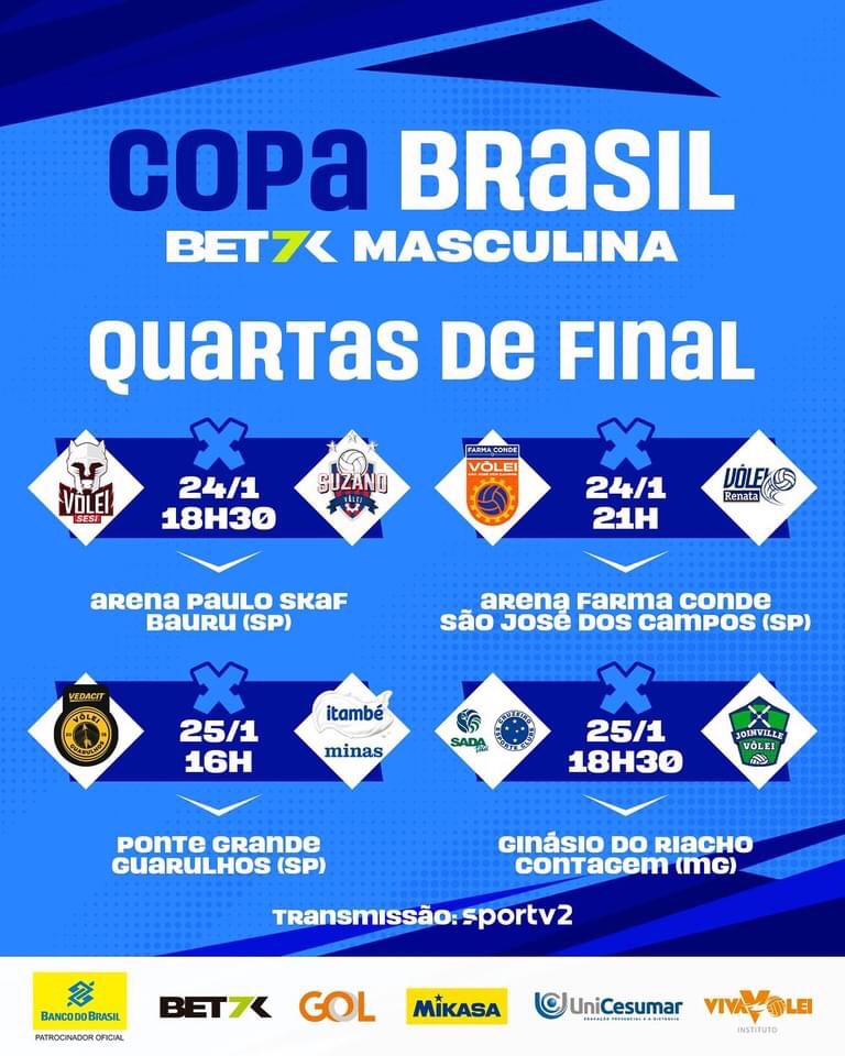 Com o encerramento do turno da Superliga Masculina 2023/2024, foram definidos os confrontos da Copa do Brasil masculina de vôlei 2024. Os oito primeiros colocados da fase regular da Superliga enfrentam-se em jogo único, pelas quartas de final da competição. O líder da fase regular da Superliga, São José, pega a equipe do Vôlei Renata, 8º colocada. O segundo colocado, Cruzeiro joga com o Joinville, 7º colocado. O Sesi/Bauru, 3º colocado, enfrenta o Suzano, 6º colocado. Fechando os confrontos das quartas de final da Copa do Brasil 2024, o Vôlei Guarulhos, 4º colocado, terá pela frente o Minas, 5º colocado. Veja abaixo na arte da CBV, as datas e os locais das quartas de final da Copa do Brasil 2024.