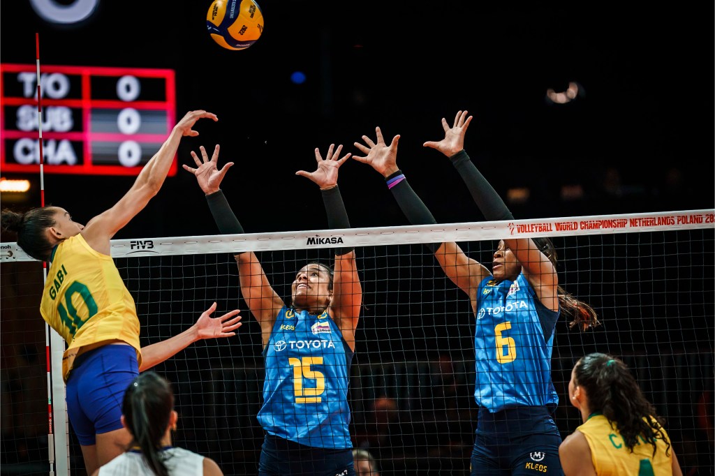 A central Carol marcou 5 pontos de bloqueio, de um total de 13 pontos do Brasil no fundamento/Divulgação FIVB