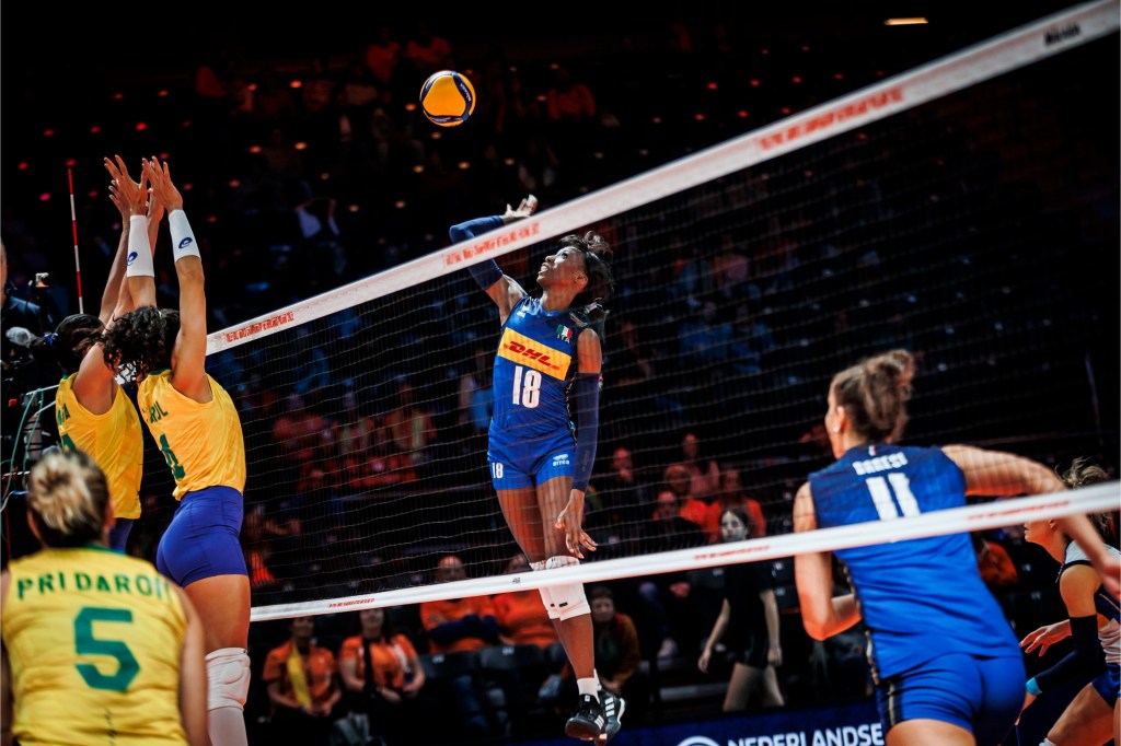 A oposta italiana Egonu oscilou no confronto com o Brasil/Divulgação FIVB