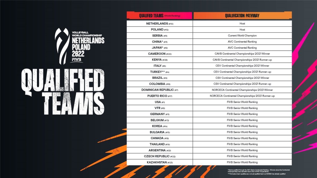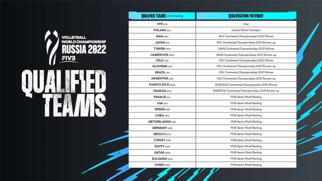 Encerrados os campeonatos continentais, foram definidas as 24 seleções classificadas para o Mundial de 2022, nos dois naipes. No masculino, garantiram presença os campeões e vice-continentais, os doze melhores colocados no ranking da FIVB, o atual campeão mundial e o país sede. No feminino, também garantiram vaga os campeões e vice-continentais, o atual campeão mundial, os onze melhores colocados no ranking da FIVB, além dos dois países sede. Confira a lista abaixo.