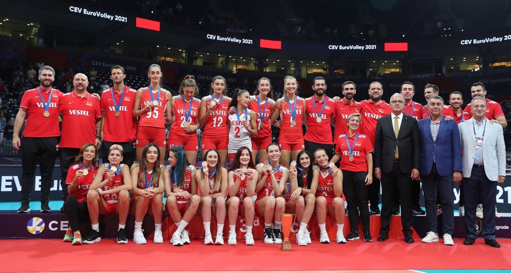 A Turquia ficou com a medalha de bronze no Campeonato Europeu feminino de vôlei 2021. Foi a quinta medalha turca na história do campeonato continental, a terceira de bronze. Anteriormente, a Turquia foi prata em 2003 e 2019, e bronze em 2011 e 2017. Neste ano, na disputa do bronze, contra a Holanda, a Turquia venceu o confronto, pelo placar de 3×0, com parciais de 25/20, 25/19, 25/23, repetindo o placar da 1ª fase. A ponteira turca Baladin marcou 13 pontos. No entanto, a maior pontuadora do jogo foi a ponteira holandesa Anne Buijs, com 14 pontos. Com o resultado, foi a segunda vez na história do Europeu que a Holanda perdeu a disputa do bronze. A última vez que isso aconteceu foi na edição de 2003.