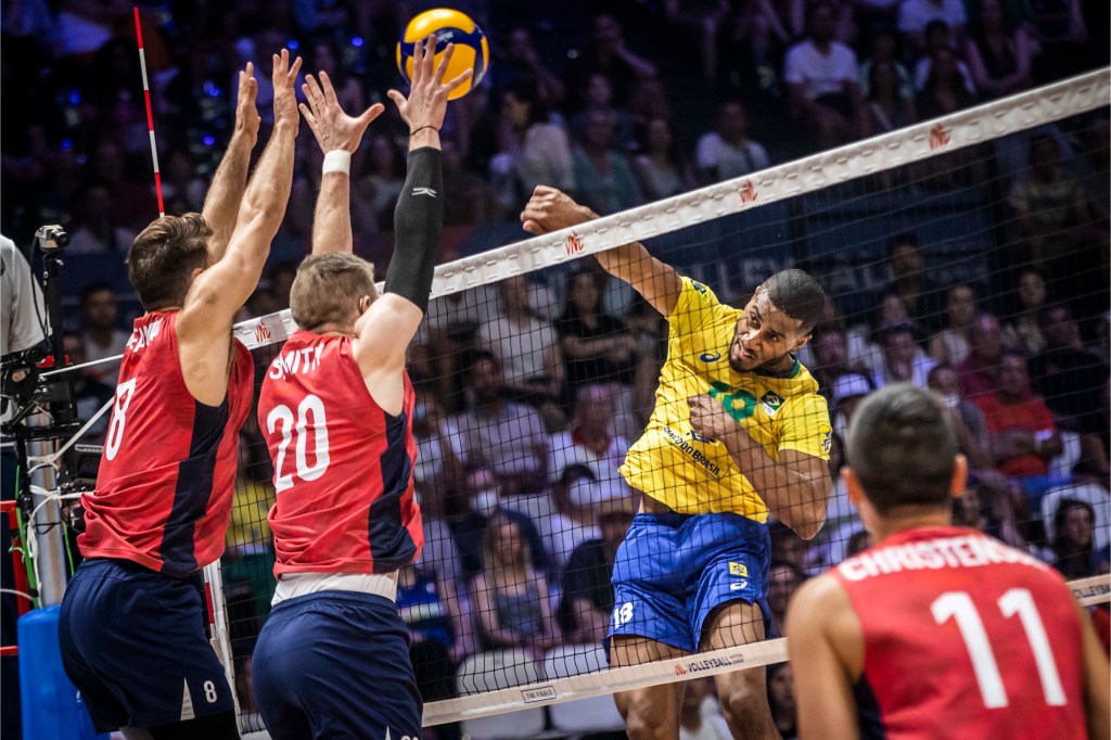 O bloqueio norte-americano marcou mais que o dobro de pontos do que o bloqueio brasileiro. Ao todo, foram 7 pontos no fundamento contra 3 do Brasil/Volleyball World/Divulgação FIVB