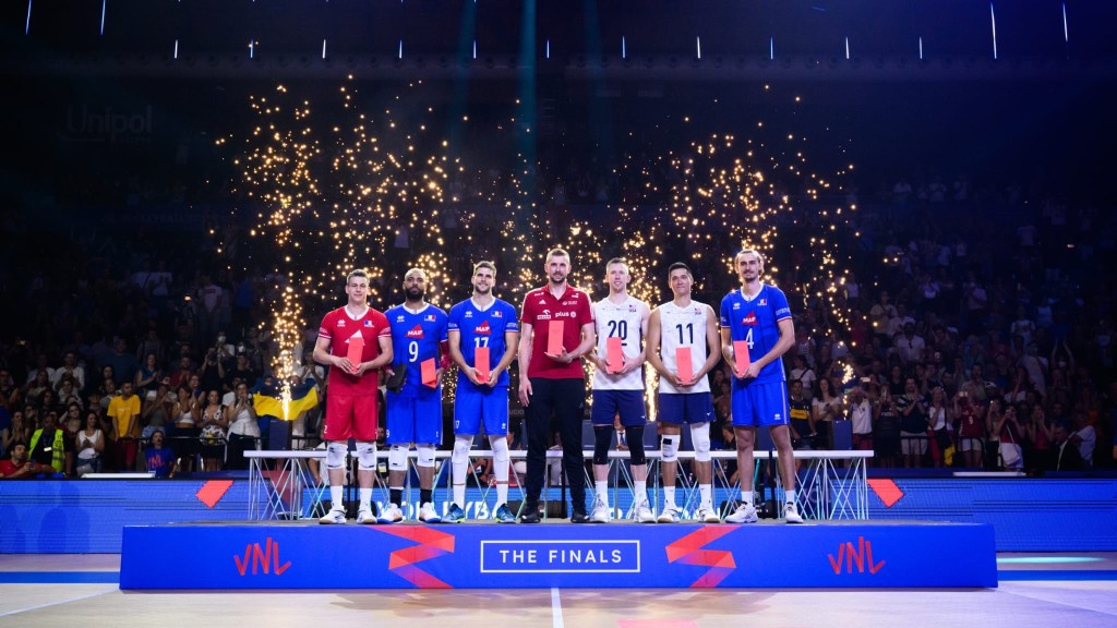 A seleção da VNL masculina 2022. O ponteiro Ngapeth da França, número 9, recebeu o prêmio de MVP/Volleyball World/Divulgação FIVB