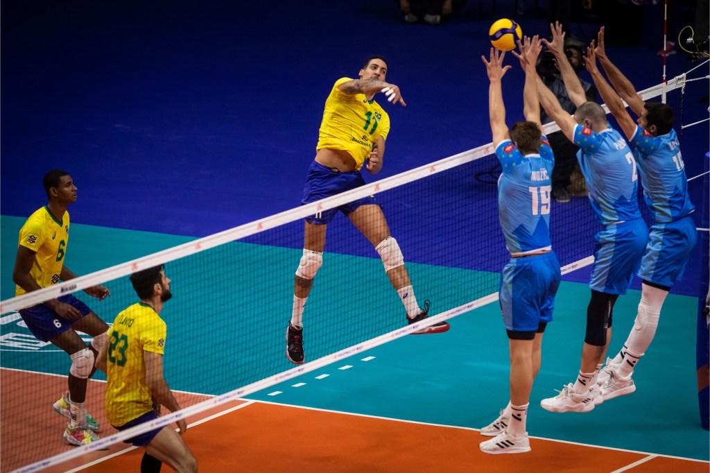 O ponteiro Rodriguinho do Brasil foi responsável por 4 pontos diretos no serviço/Volleyball World/Divulgação FIVB
