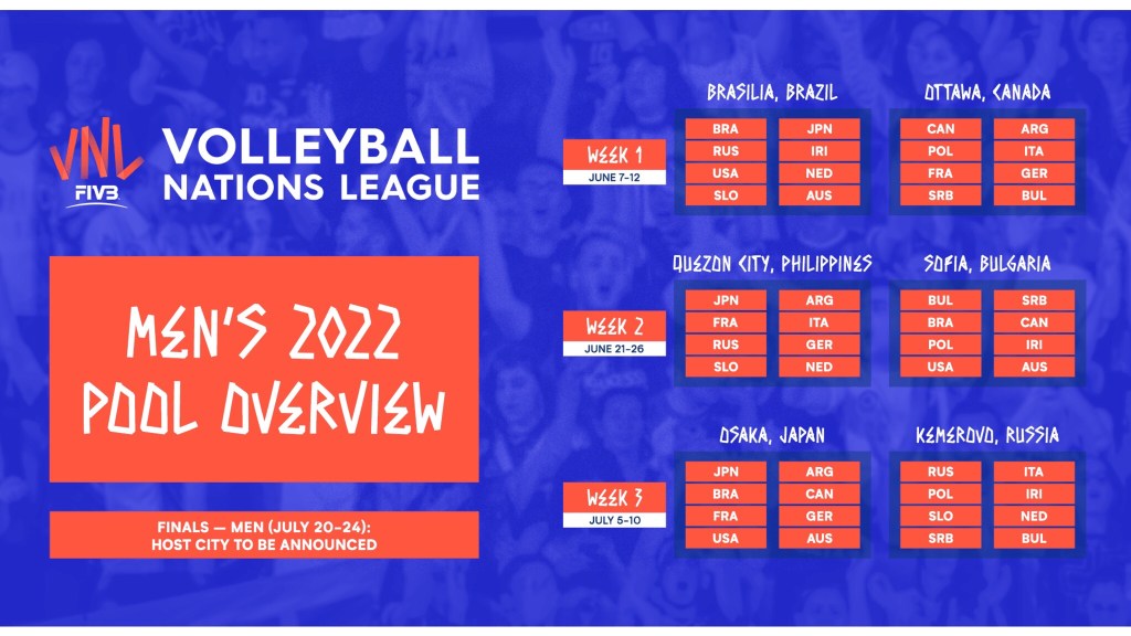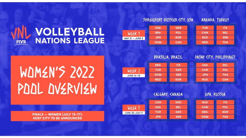 No último dia 26 de Janeiro, a Federação Internacional de Vôlei (FIVB) detalhou os confrontos da Liga das Nações 2022. Em um novo formato, nos dois naipes, 16 seleções realizarão 12 partidas, em 3 semanas. Com duração de 6 semanas, a fase regular da competição acontecerá com espaço entre uma semana e outra. Em cada sede, 8 países se enfrentam, com 4 jogos para cada seleção.