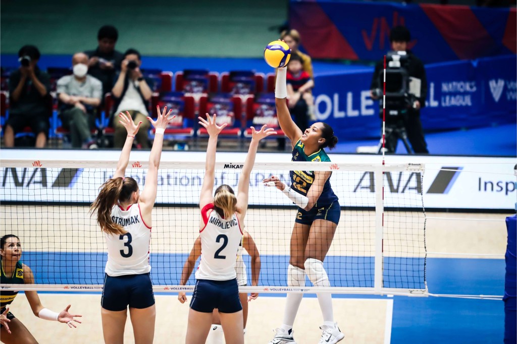 Pela segunda semana da Liga das Nações feminina 2023, disputada em Brasília, o Brasil venceu a Sérvia. Na reedição da última final do Mundial, o Brasil superou a Sérvia, por 3×2, com parciais de 23/25, 25/22, 21/25, 25/12, 15/11. Brasileiras e sérvias fizeram um confronto com muitos altos e baixos. Para se ter uma ideia, o técnico da Sérvia, Giovanni Guidetti, fez um rodízio de atacantes, principalmente nas pontas. Porém a partir da quarta parcial, o Brasil dominou o jogo, com um show de bloqueios. Somente a central Thaísa do Brasil marcou 9 pontos diretos no fundamento. Ela também encerrou o jogo como maior pontuadora do confronto, com 18 pontos. Pela Sérvia, a jovem Uzelac marcou 17 pontos. Na próxima rodada da VNL 23, o Brasil folga. Seu próximo compromisso na competição é contra a Alemanha no sábado, 17 de junho, às 14h. Já a Sérvia joga com a Tailândia, nesta sexta-feira, 16 de junho, às 21h.