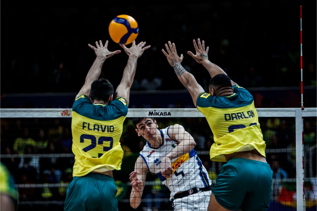 O ponteiro italiano Michieletto em ação contra o bloqueio brasileiro/Divulgação/Volleyball World