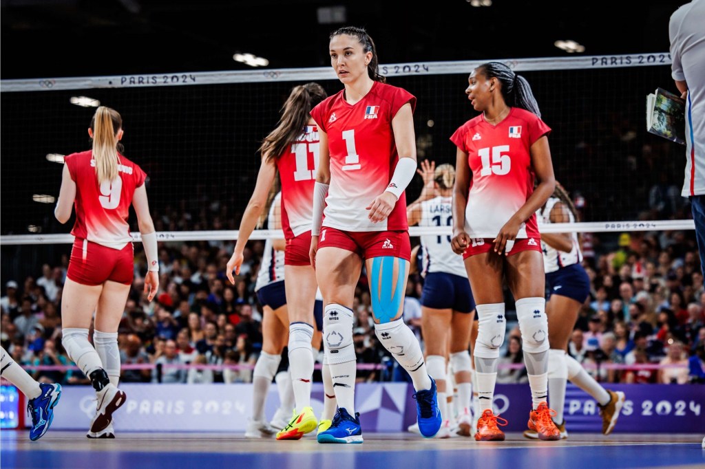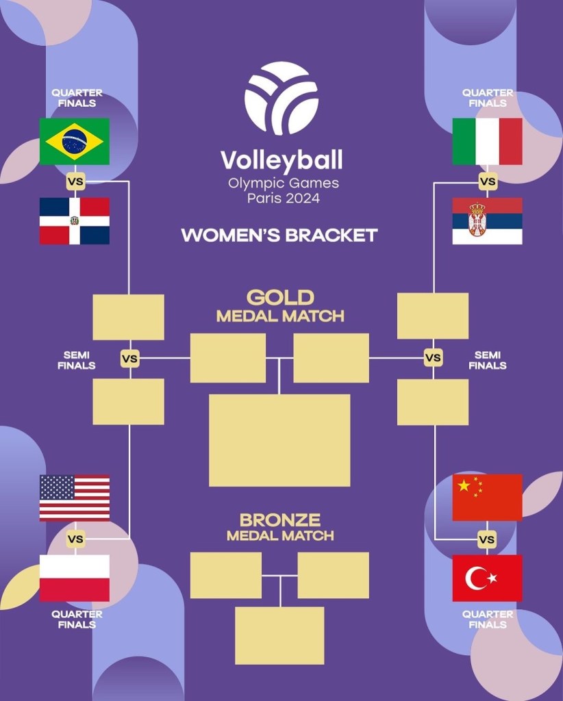 Abrindo a fase eliminatória do voleibol feminino na Arena Paris Sul, China e Turquia fizeram o jogo mais disputado das quartas de final. As chinesas começaram na frente, colocando a Turquia em dificuldades, com alto aproveitamento no ataque. Na segunda parcial, a Turquia aumentou o seu aproveitamento no fundamento, conseguindo abrir uma boa vantagem no placar. A China foi buscar o prejuízo no marcador, mas a Turquia fechou o set, empatando o jogo em 1×1. Na terceira parcial, o roteiro do set anterior se repetiu, com a Turquia abrindo grande vantagem no placar e a China ensaiando uma reação. Dessa vez, quase deu, com 25/23 para Turquia. Na quarta parcial, quem sobrou no começo foi a China, abrindo grande margem no placar, mas assim como adversárias anteriormente, a Turquia também ensaiou uma reação. No fim, deu China, 25/21. No tie-break, a Turquia fechou o jogo em 15/12, com grande atuação da oposta Vargas. Mesmo sobrecarregada, ela marcou 42 pontos no confronto. A maior performance dos Jogos até o momento. Pela China, Ying Ying Li anotou 25 pontos.
