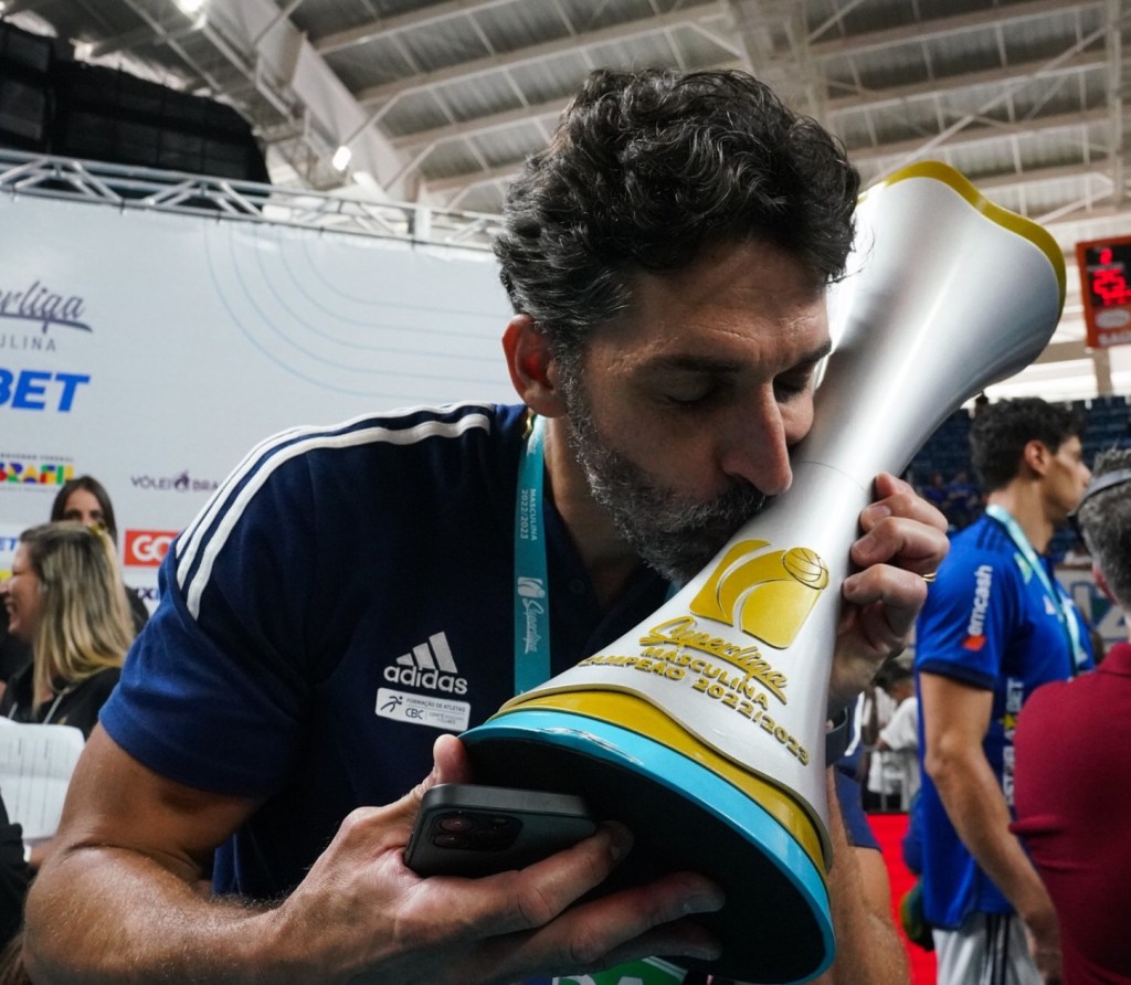 O técnico do Sada/Cruzeiro, Filipe Ferraz, com a taça da Superliga/Divulgação/CBV/Maurício Val/FVImagens